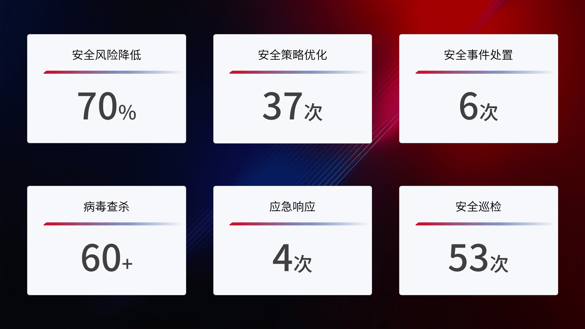 提供全面的安全事件报告体系,,包括处置报告、、、、周报、、季度和年度总结,,结合持续监控,,,,帮助客户深入了解网络安全状况。。。。