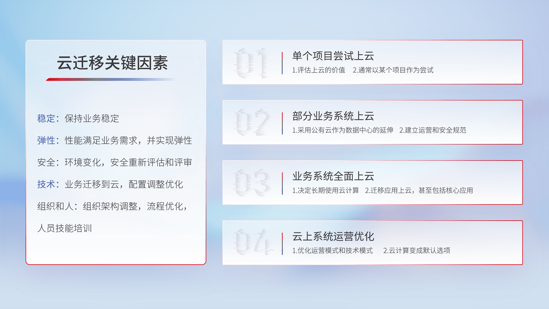 结合实际业务,,,,从规划设计、、云平台选型、、、、云原生改造、、数据迁移、、集成交付,,,迁移全过程为客户识别最佳上云路径,,,做好风险识别管理,,设计网络架构、、、身份权限、、安全审计合规、、、、操作审计、、、、日志审计、、、监控告警策略、、、多站点容灾设计等,,,对云上基础设施进行整体规划,,,提升IT治理水平,,以满足弹性、、、高可用、、高性能的需求。。